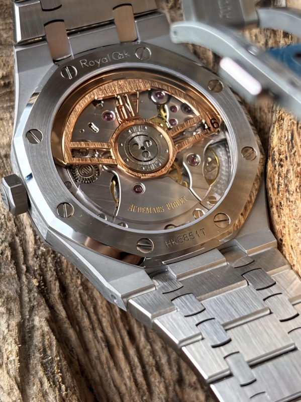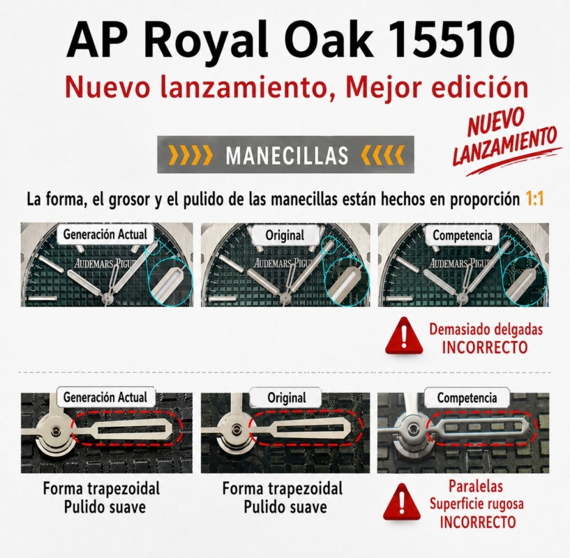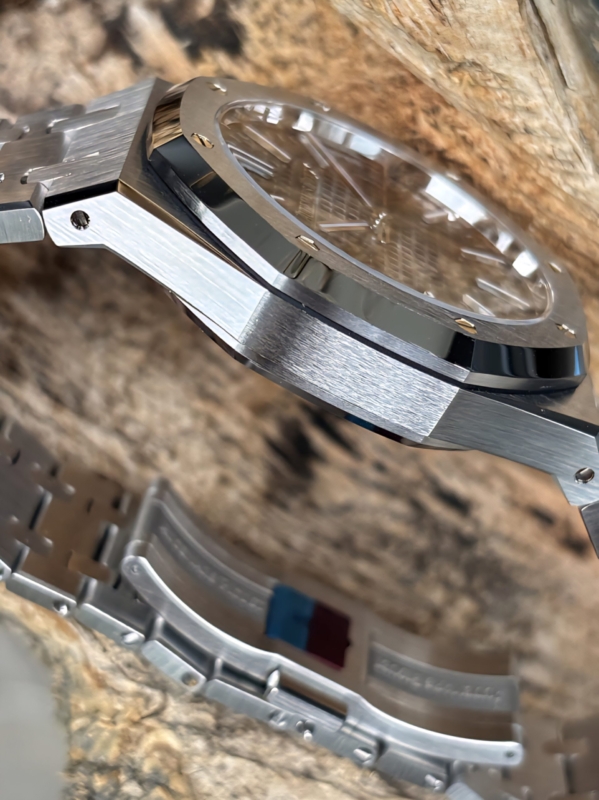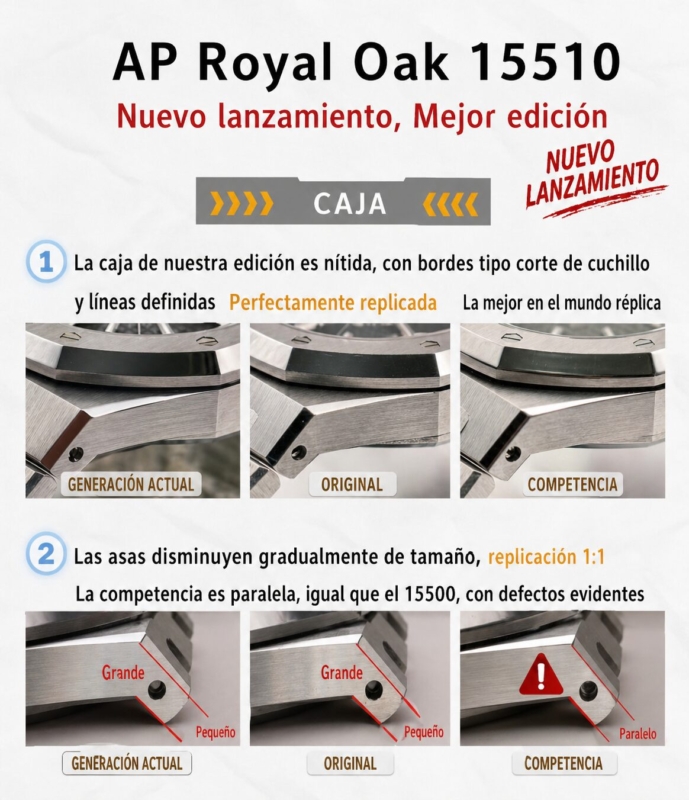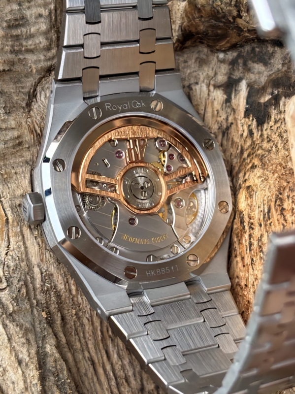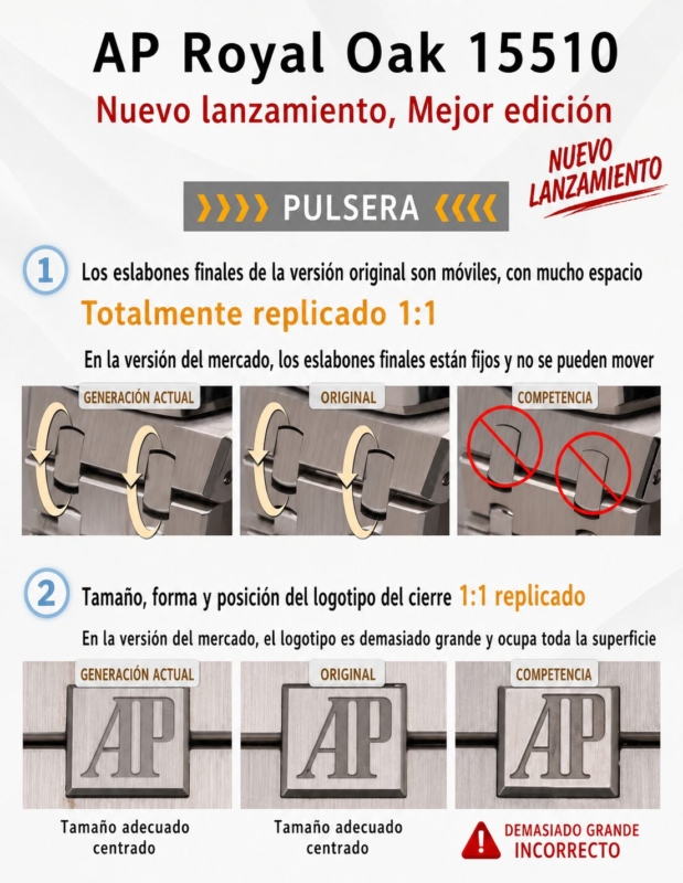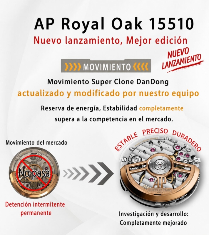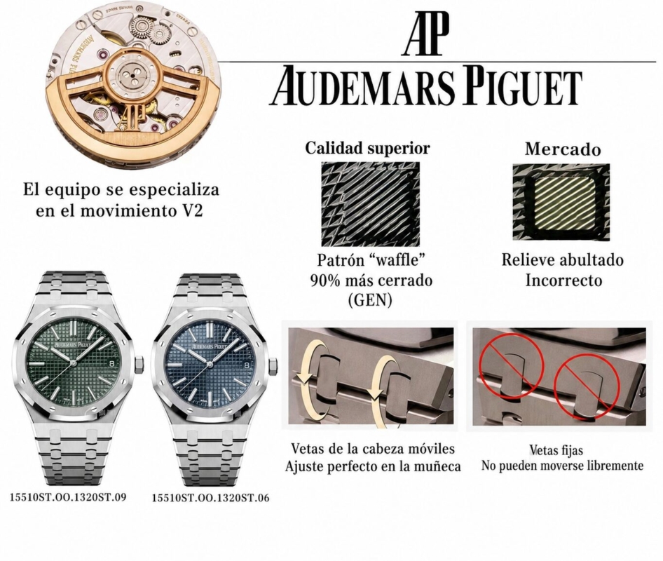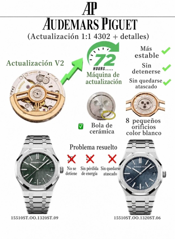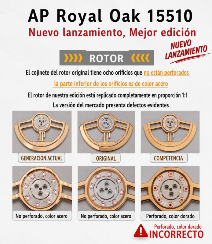 1. Se ha adquirido un AP 15510 original con el propósito de desarrollar el calibre 4302. Cabe destacar que los ocho orificios pequeños del cojinete del rotor de este movimiento son de color acero. En contraste, las versiones disponibles en el mercado continúan utilizando el movimiento 15500, que presenta orificios en tono oro rosa.