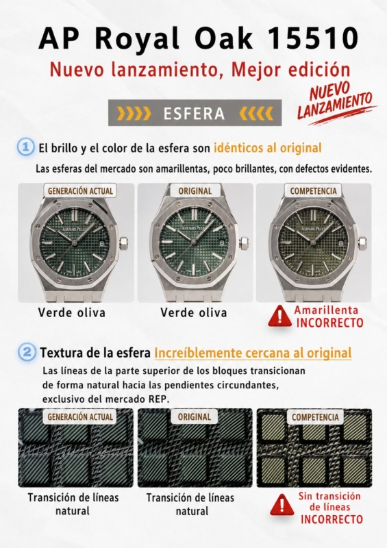 3. El patrón de gofre de la esfera presenta una similitud del 90% con el diseño original, posicionando a nuestro fabricante como el líder en la reproducción de este efecto, sin parangón en el sector. El meticuloso patrón de cuadrícula de pirámide pequeña y el efecto de luz y sombra radiante de los círculos concéntricos son idénticos a los del original.