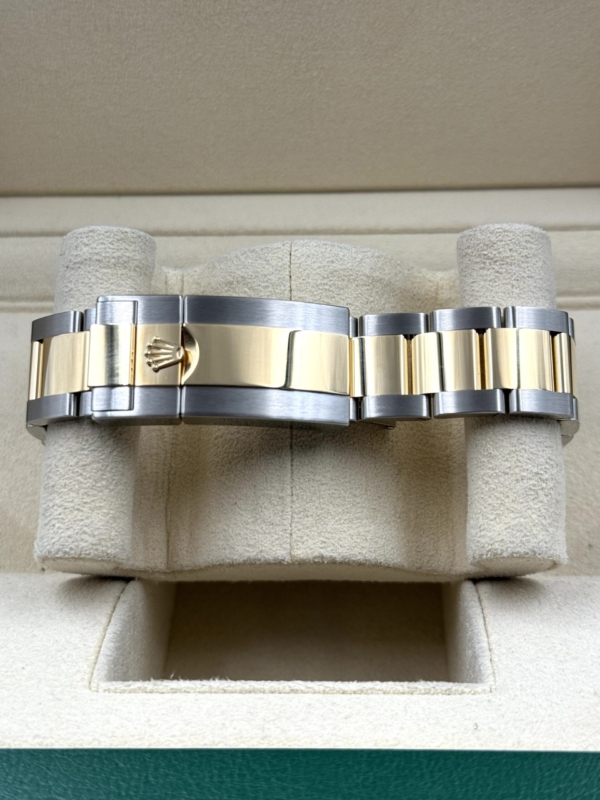 Correa: Brazalete replicado 1:1 en acero inoxidable 904L macizo, chapado en oro amarillo de 18 quilates, con un tratamiento metálico especial para incrementar su peso y alinearlo con el de un reloj de oro genuino.