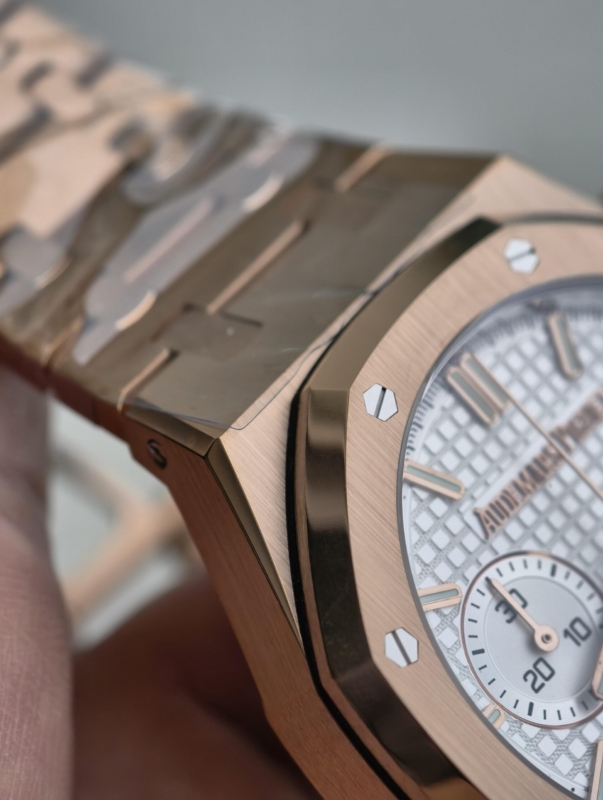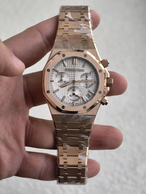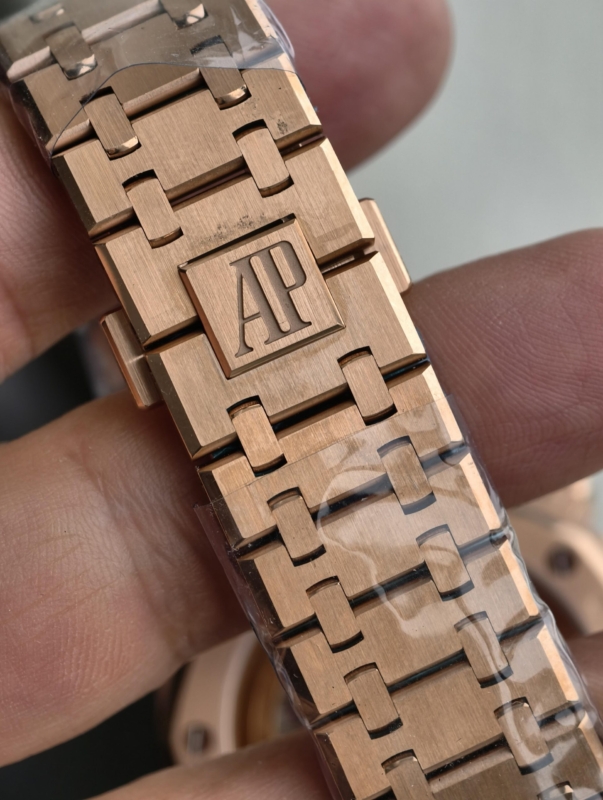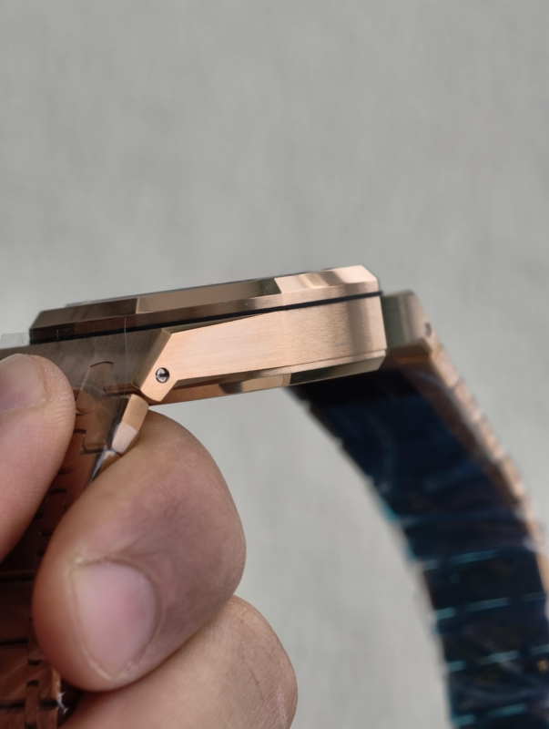 MATERIAL DE LA CAJA: Caja de acero inoxidable 316L macizo chapada en oro rosa de 18 quilates con tratamiento especial de aumento de peso (~205 gramos )