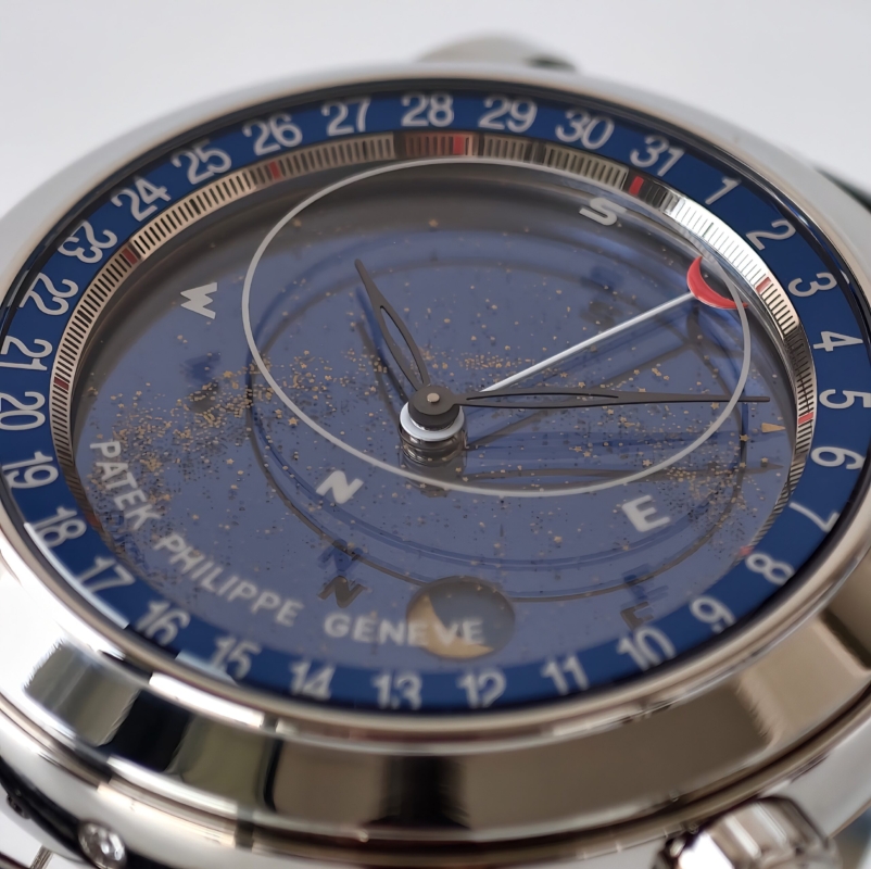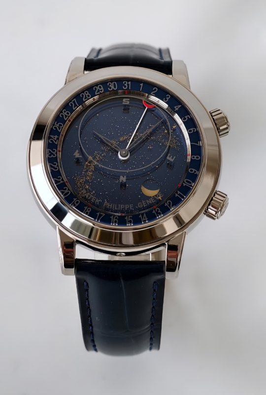 Funcionalidades: Incorpora visualización de horas, minutos, fecha y fases lunares. La corona superior gestiona el ajuste horario, mientras que la inferior permite la manipulación manual del disco de fases lunares, enfatizando su operación no automática. Un pulsador lateral redondo facilita el ajuste de la fecha y, simultáneamente, la visualización de las fases lunares.